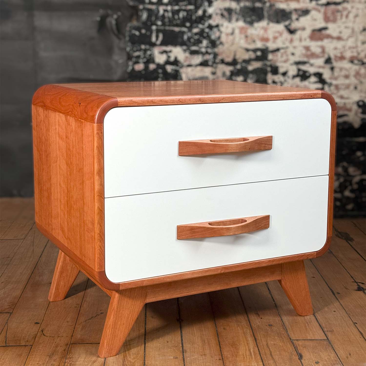 Solid cherry, dovetail drawers, white Formica laminate on maple plywood with carved, solid cherry drawer pulls, soft-close, finished in clear coat.