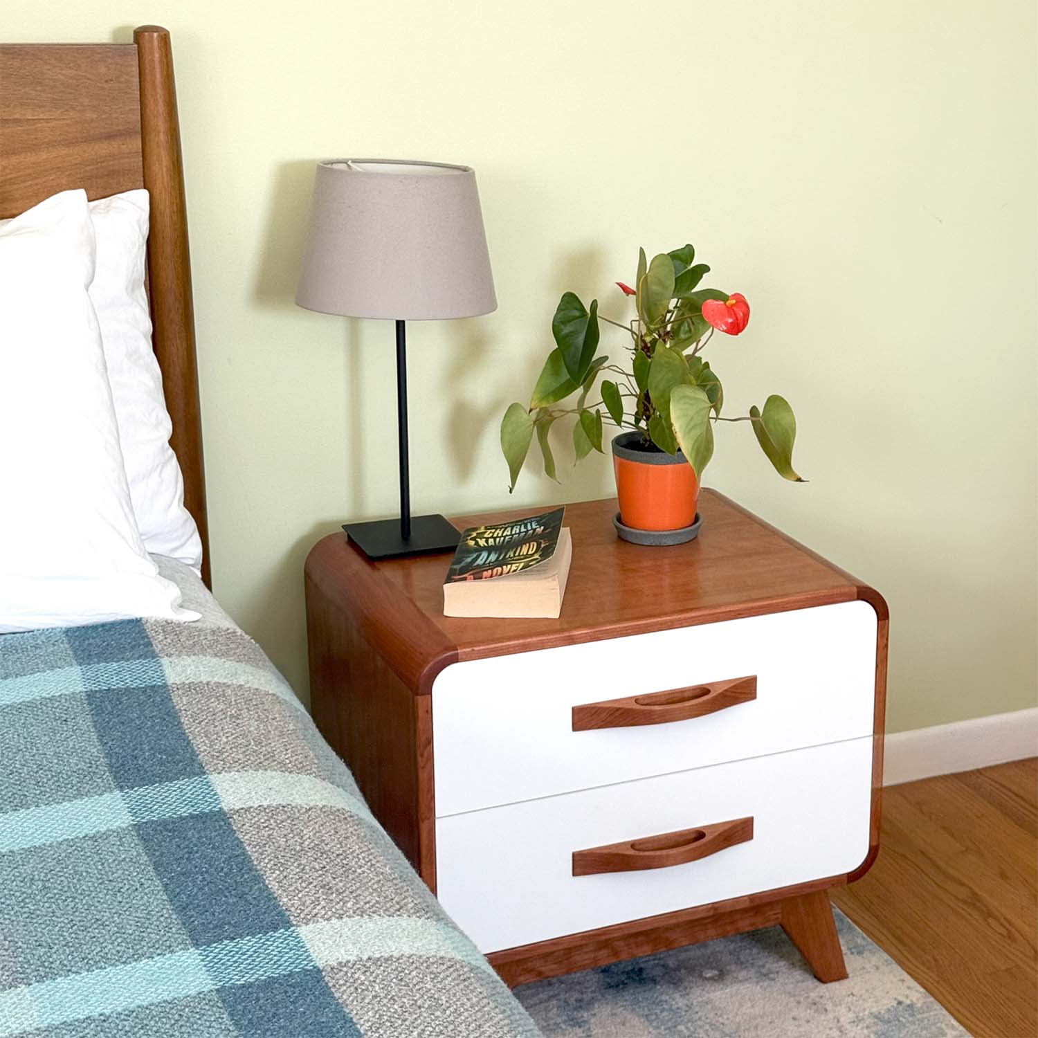 Mid-century modern design with rounded joined edges, this heirloom quality night stand matches the design of the complete Kinderset baby and child’s bedroom set.